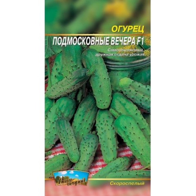 Вечори Підмосков 'яF1 Ранній, партенокарпічний гібрид жіночого типу цвітіння з добрим врожаєм. У вузлах формуються 1-2 плоди. Зеленці бугристі білошипі, з середньою опушеністю, довжиною 12-14 см, темні зелений, придатний для засолювання та консервування