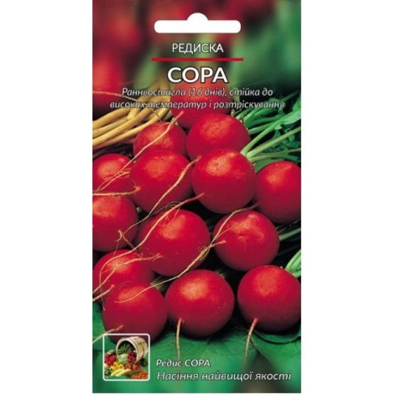 Німецький. Ранньостиглий сорт, стійкий до високих температур і розтріскування. Від розсади до технічна зрілість – 16-20 днів. Підходить для весняного, літнього та осіннього вирощування. Коріння круглі, діаметром 3-4 см, карміново-червоного кольору з білою, ніжною м 'якоттю.
